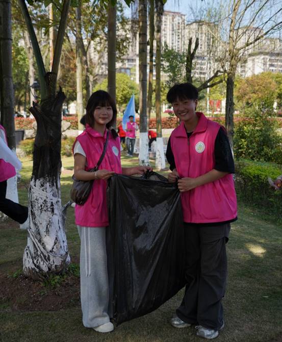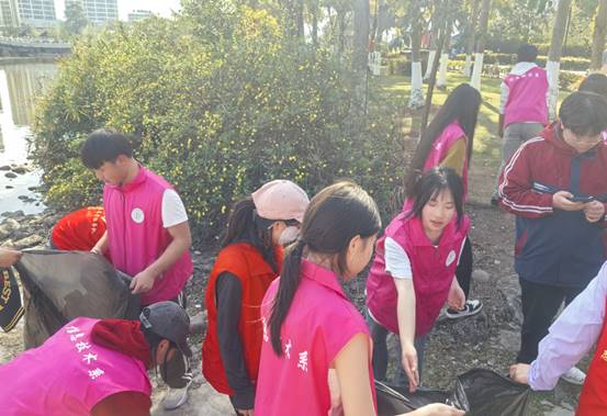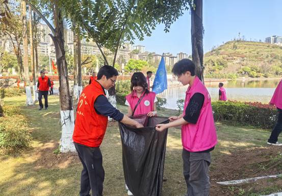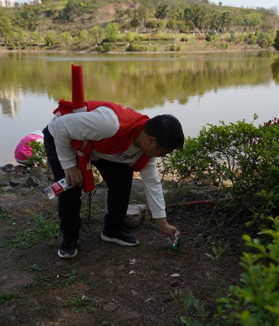 沿着凤凰湖畔的绿道,一场别开生面的"环保实践课"正在展开。党员教师们躬身示范,带领学生们手持清洁工具,沿着步道两侧仔细捡拾烟头、纸屑等垃圾。阳光下,跃动的"红马甲"与潋滟湖光相映成趣,勾勒出一幅生动的生态文明画卷。张副校长表示:"这堂户外实践课,让我们既在'脸上有笑'中感受自然之美,更在'肩上有责'中践行生态之责,这才是劳动教育的真谛。"