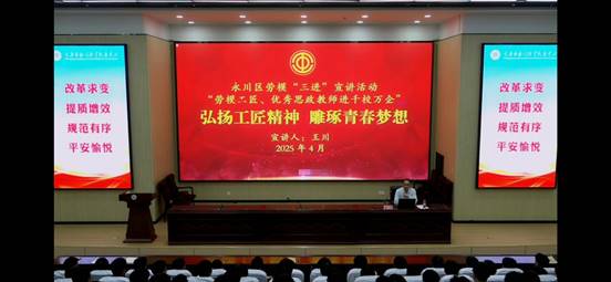 第二阶段由永川区“劳模工匠”服务队成员、重庆华中数控技术有限公司王川书记进行“弘扬工匠精神,雕琢青春梦想”的专题宣讲。他以工匠精神为切入点,阐释其核心内涵——执着专注、精益求精、一丝不苟、追求卓越,并分享了大国工匠崔兴国、杨戌雷等人的奋斗故事,展示了工匠精神在产业一线的实践价值。