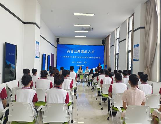 在现代商务系智慧旅游实训室,中哈学子展开研讨交流。系主任以“共育丝路商旅人才”为题,分享了我校在旅游服务与管理专业教学实践方面的经验,探讨了中哈合作的新机遇。此次交流不仅为两校师生搭建了友谊的桥梁,更为“一带一路” 倡议下沿线国家的教育合作提供了新的思路和范例。
