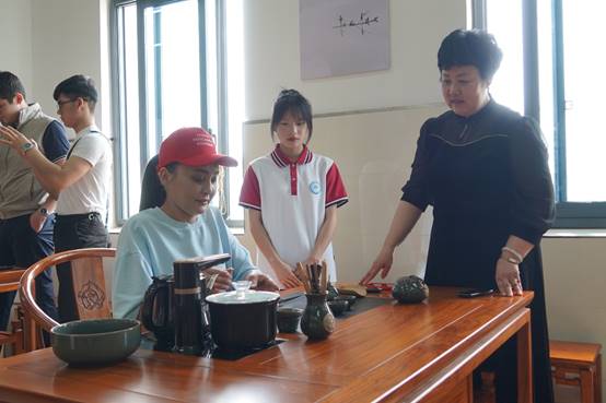 移步茶艺实训室,哈萨克斯坦师生沉浸式体验中国茶文化。胡晓兰老师现场示范盖碗茶“三才杯”冲泡技艺,从温杯、投茶到“凤凰三点头”注水手法,生动诠释“天盖之、地载之、人育之”的茶道哲学。我校学生“一对一”指导哈方师生体验泡茶流程,通过闻香、观色、品茗,感受中国茶文化“和敬清寂”的精神内涵。茶文化作为中国传统文化的重要组成部分,以其独特的韵味和深厚的文化底蕴,成为了中哈文化交流的一张亮丽名片。